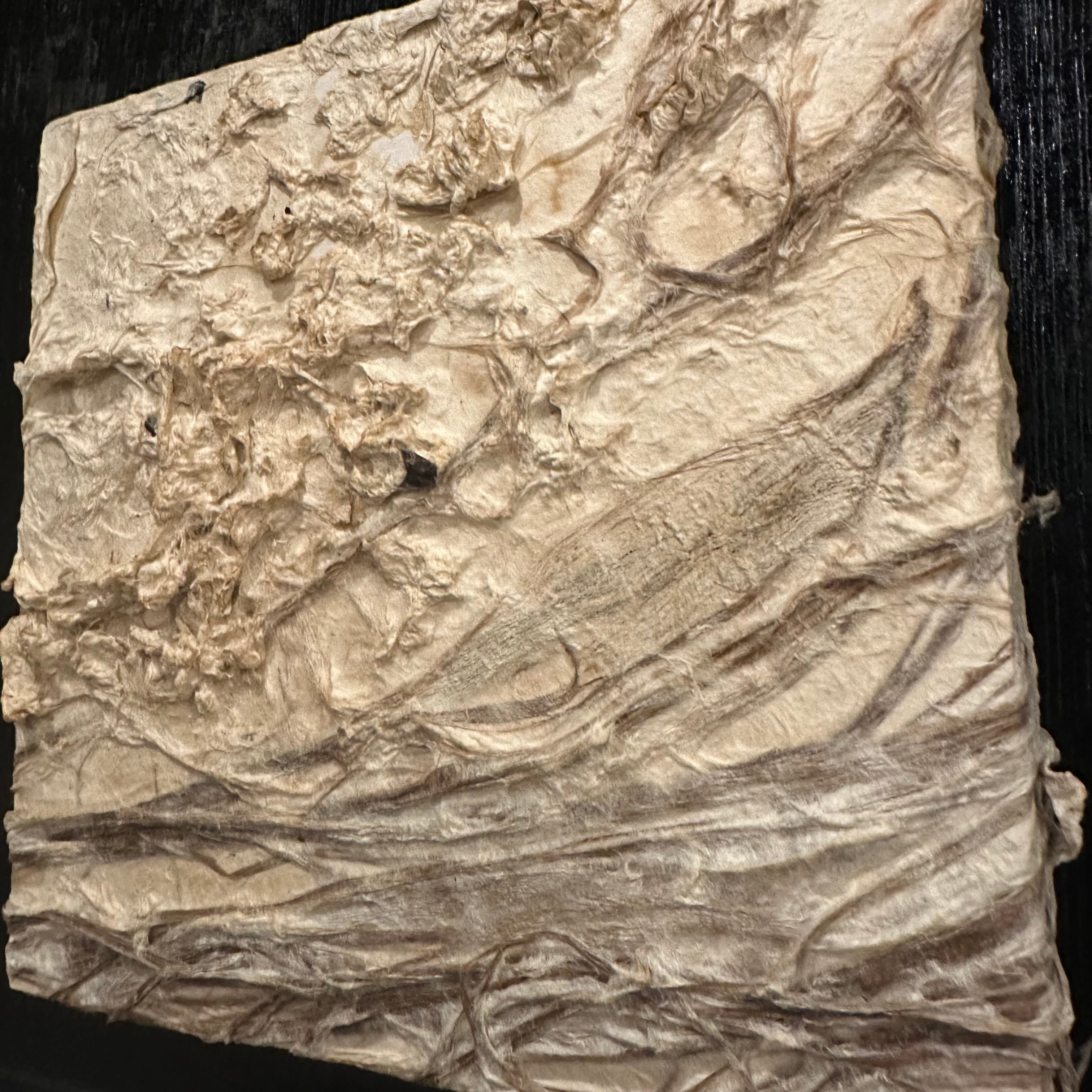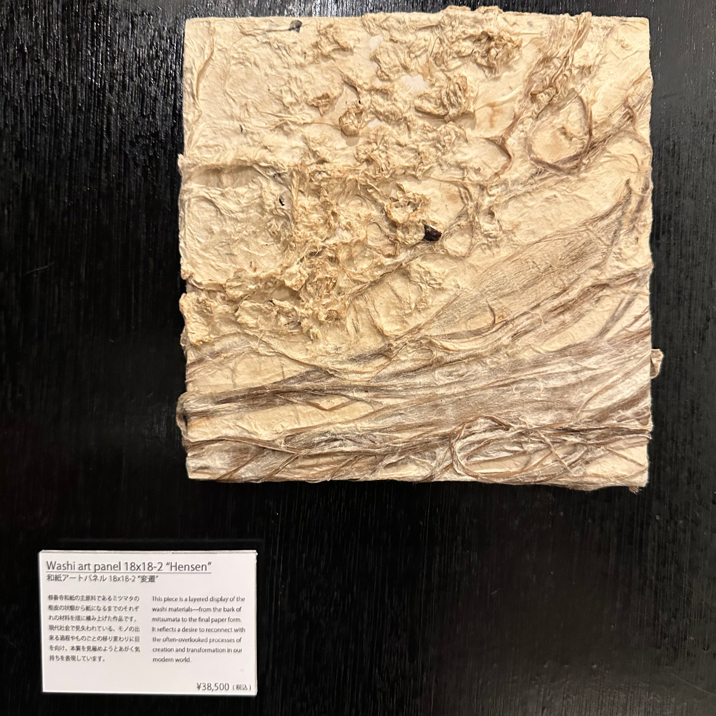 修善寺和紙の主原料であるミツマタの樹皮の状態から紙になるまでのそれぞれの材料を順に積み上げた作品です。