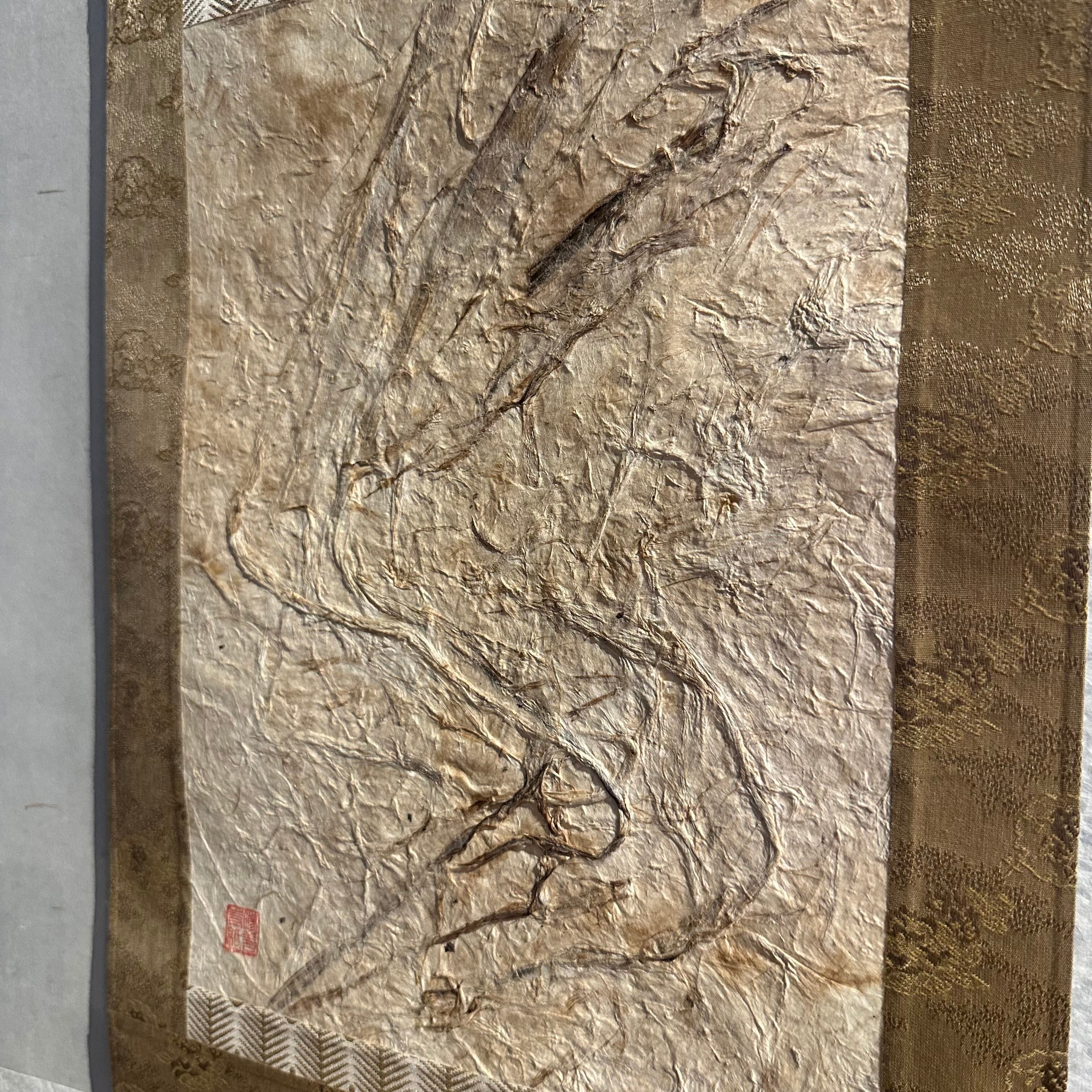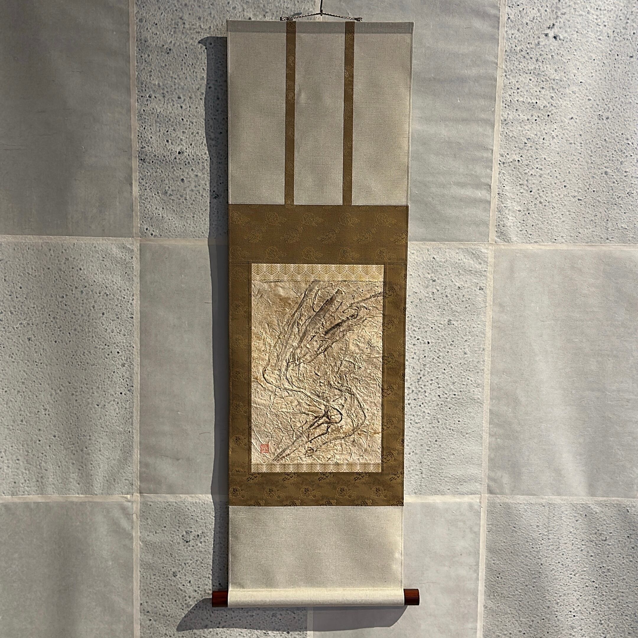 掛け軸らしからぬゴツゴツとしたテクスチャーのため、ゆるっとしか巻けず、もはや掛け軸ではないのかもしれませんが、だからこそ唯一無二の仕上がりになりました。